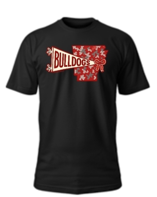 Show off your school spirit in style with this bold Bulldogs Arkansas Tee! Printed on a premium Gildan Softstyle® t-shirt, this design features a red megaphone with “BULLDOGS” across a camo-patterned Arkansas silhouette topped with a classic cheer bow.
