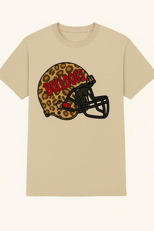 Show off your team spirit in style with this Bulldogs graphic tee. Featuring a bold leopard print football helmet design with “BULLDOGS” in striking red across the top, this shirt combines sporty pride with a trendy twist. Printed on a soft, beige cotton tee, it’s perfect for game days, school events, or casual wear.